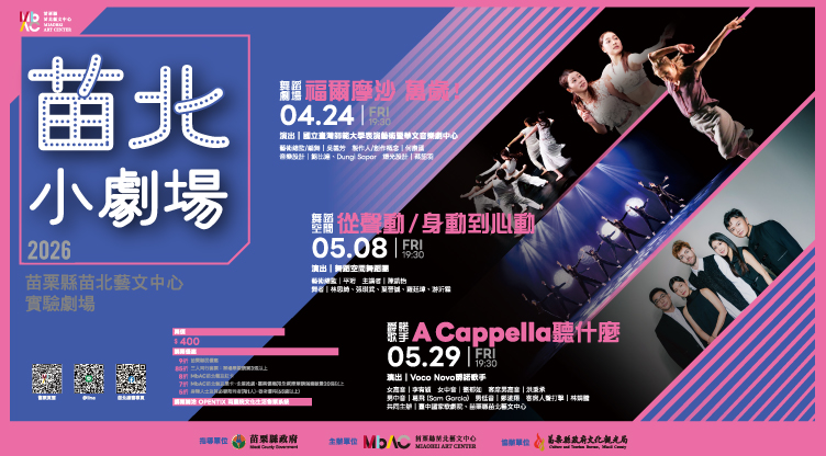 「苗北小劇場」以小型藝術季的概念籌畫精緻系列節目,於本中心實驗劇場打造黑盒子獨特的觀賞體驗,為苗北春季拉開序幕,發揮實驗劇場高機動性的靈活優勢,玩轉劇場的無限創意。
