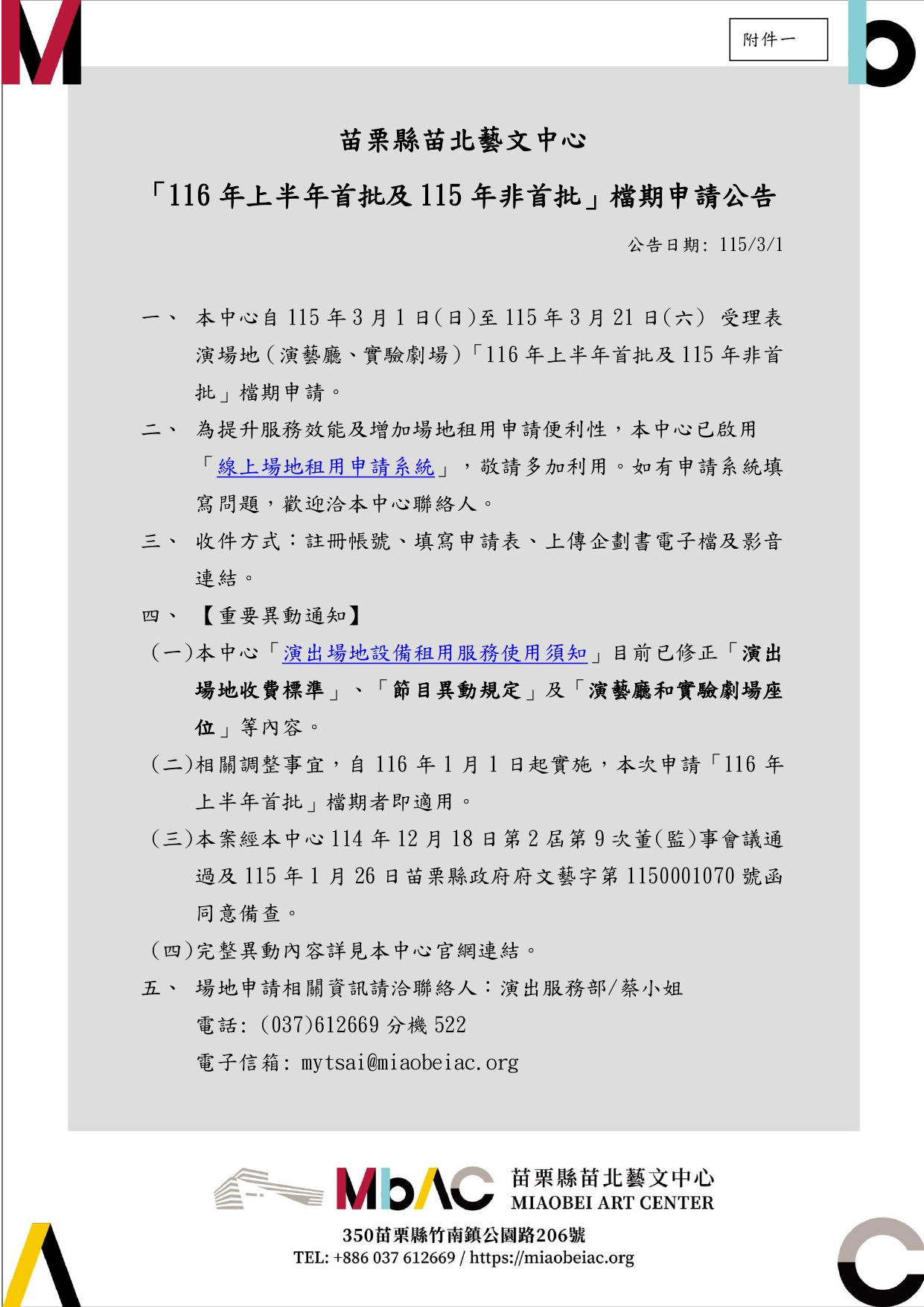 「116年上半年首批及115年非首批」檔期申請公告(含116年重要異動通知-「演出場地收費標準」、「節目異動規定」及「演藝廳和實驗劇場座位」)